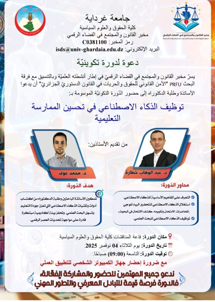 فعاليات الدورة التكوينية “توظيف الذكاء الاصطناعي في تحسين الممارسة التعليمية 4 نوفمبر 2025 إعلانات, التظاهرات, غير مصنف, مساهمات الأساتذة, نشاطات الكلية 4 زيارة شاركها Facebook Twitter LinkedIn