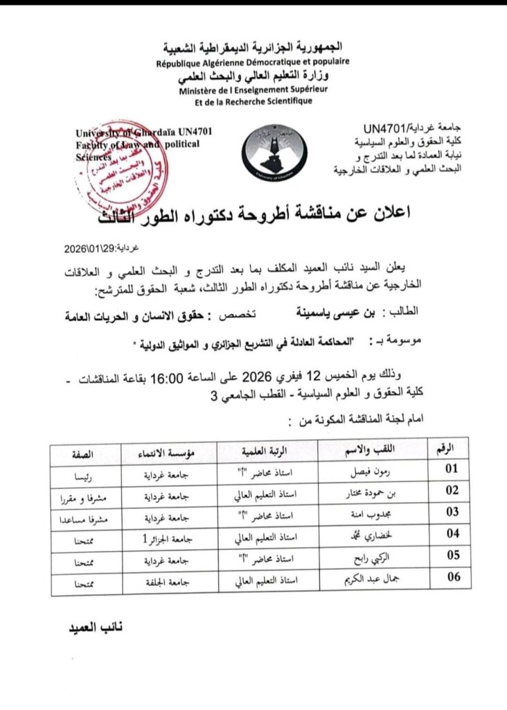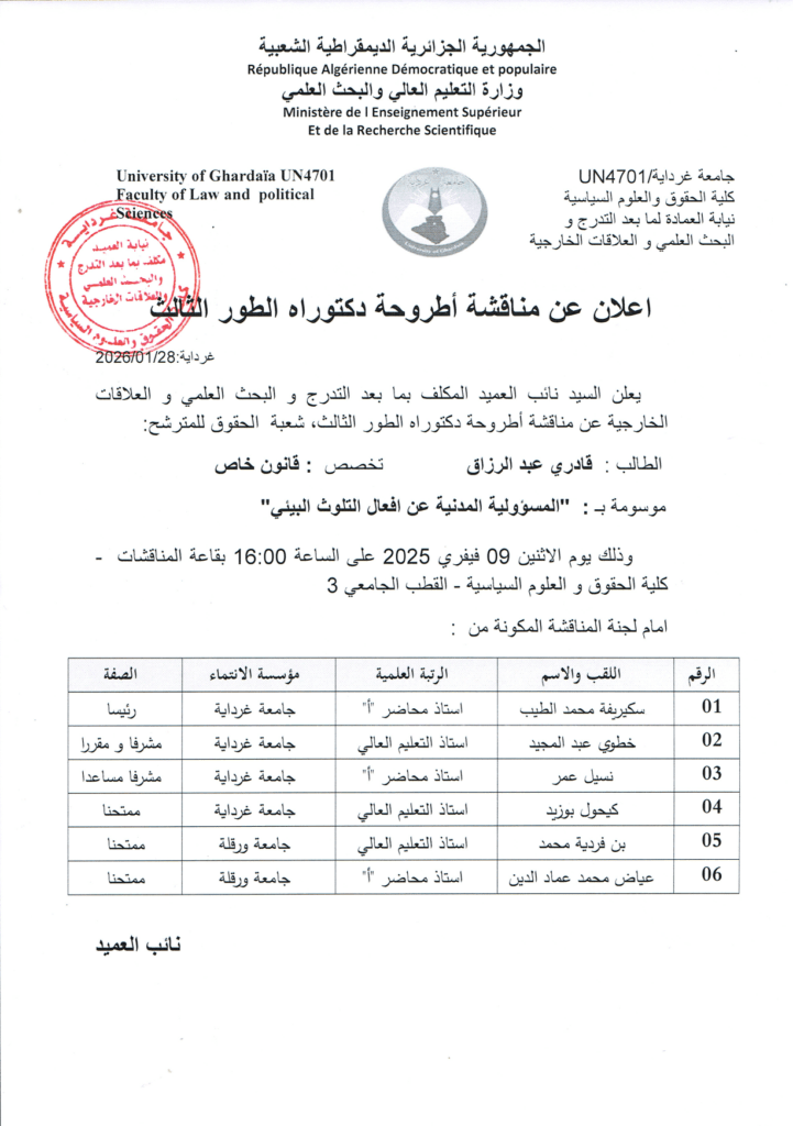 إعلان مناقشة أطروحة دكتوراه الطور الثالث 7 فبراير 2026 أطاريح دكتوراه, إعلانات 23 زيارة اعلان مناقشة قادريتنزيل اعلان مناقشة بن عيسىتنزيل شاركها Facebook Twitter LinkedIn
