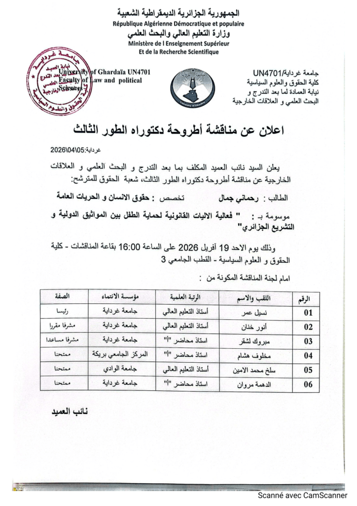 دكتوراه غرداية إعلان مناقشة أطروحة دكتوراه الطور الثالث 15 أبريل 2026 أطاريح دكتوراه, إعلانات 13 زيارة شاركها Facebook Twitter LinkedIn