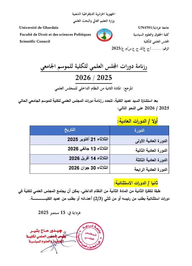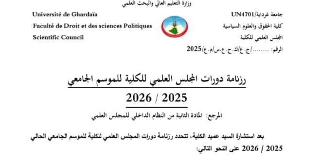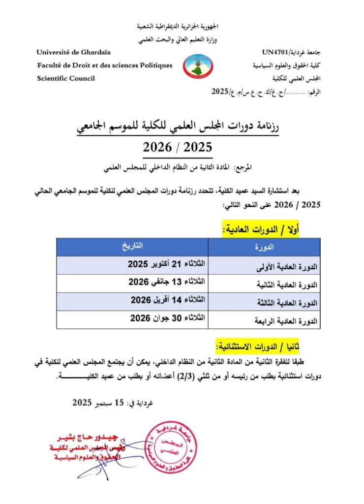 رزنامة دورات المجلس العلمي للكلية للموسم الجامعي الحقوق غردايةتنزيل