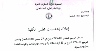 تنهي كلية الحقوق والعلوم السياسية، إلى علم الطلبة المنقطعين أو المتخلين عن الدراسة، أنه تم فتح فترة إيداع ملفات طلبات إعادة الإدماج للالتحاق بالتكوين في طوري الليسانس والماستر للموسم الجامعي 2025/2026 وذلك ابتداءا من 09 جويلية 2025 إلى 16 جويلية 2025 كآخر أجل، والتي ستكون حصريا عبر الرابط أدناه، أو …