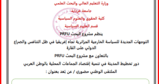 كلية الحقوق والعلوم السياسيةقسم العلوم السياسيةينظم مشروع البحث PRFUالتوجهات الجديدة للسياسة الخارجية الجزائرية تجاه إفريقيا في ظل التنافس والصراع الدولي على القارةبالتعاون مع مشروع البحث PRFUدور تخطيط المدينة في تنمية إقتصاد الجماعات المحلية بالوطن العربي الملتقى الوطني حضوري / عن بعد بعنوان :إستراتيجية التحول الرقمي ومتطلبات سياسة التشغيل وسوق العمل …